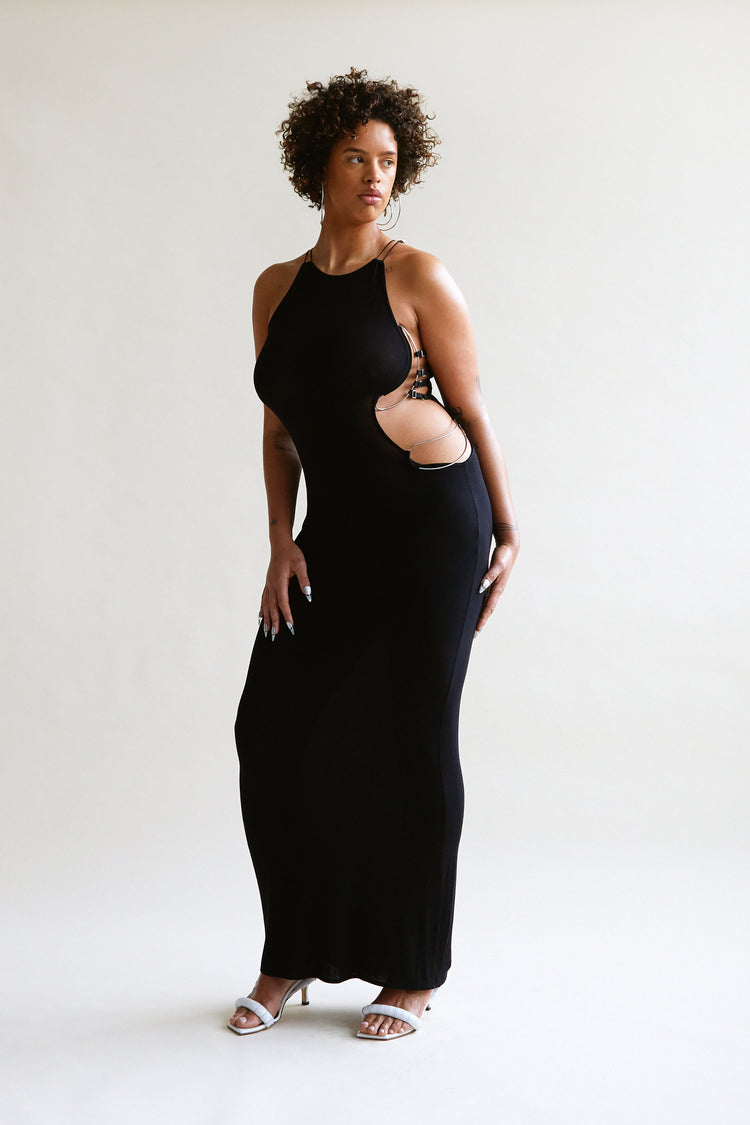 The Contour Cutout Maxi Dress embraces architectural lines and sculptural detailing. Its strategic cutouts elongate the frame, creating an interplay of presence and negative space.